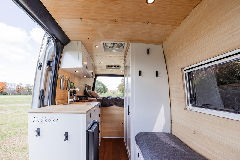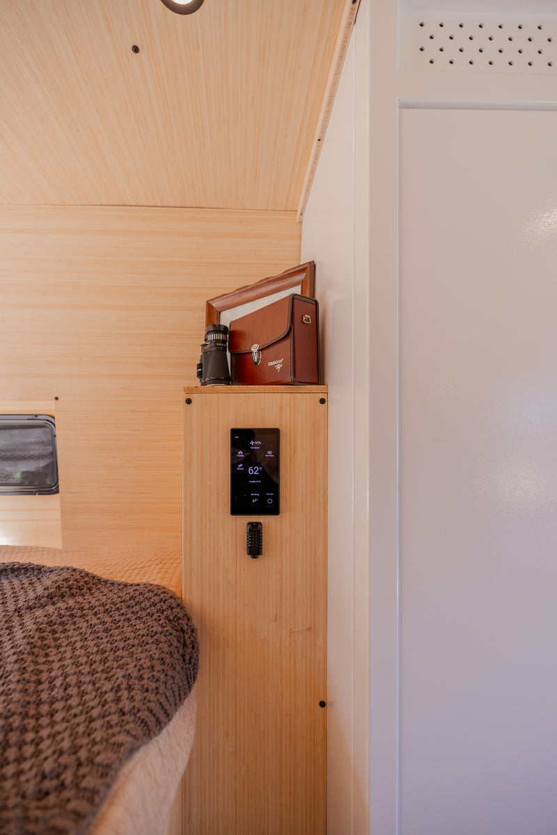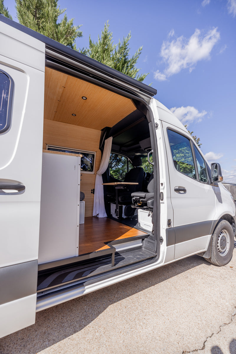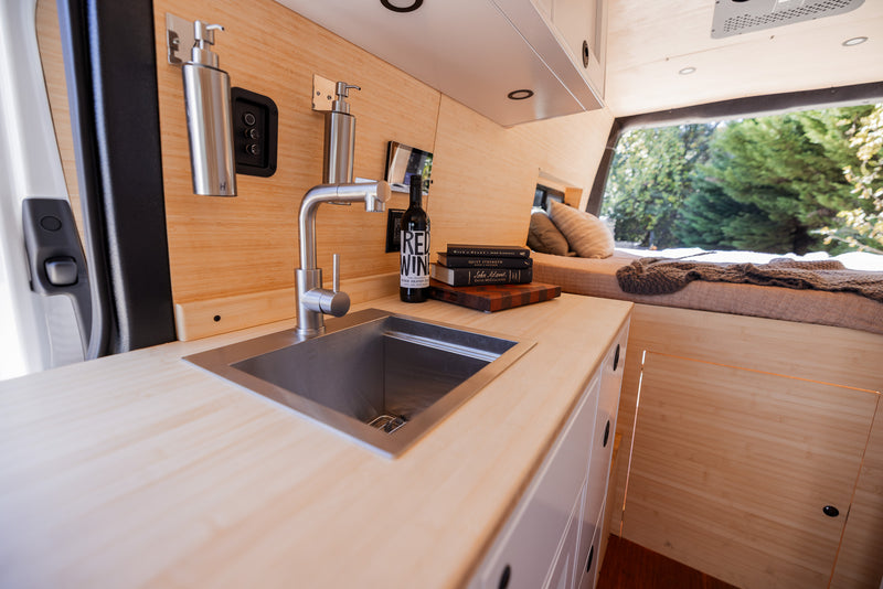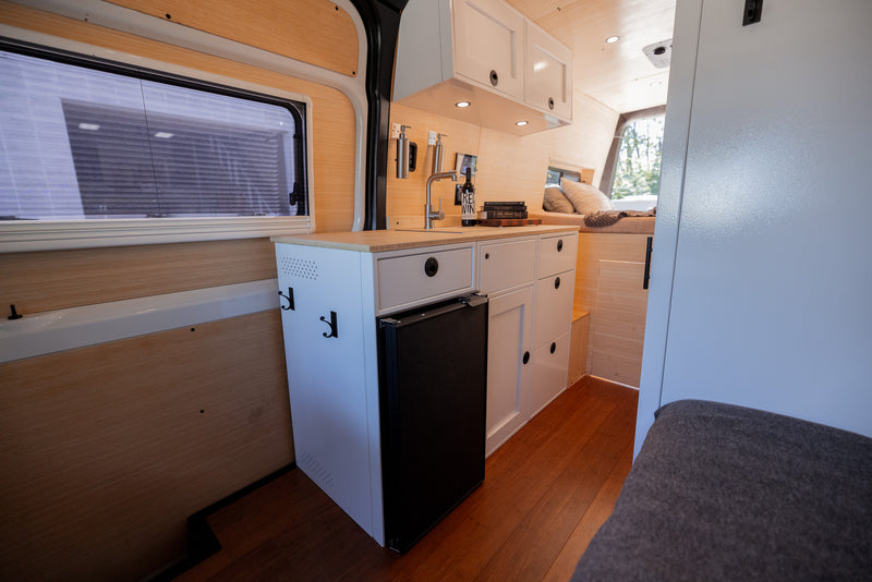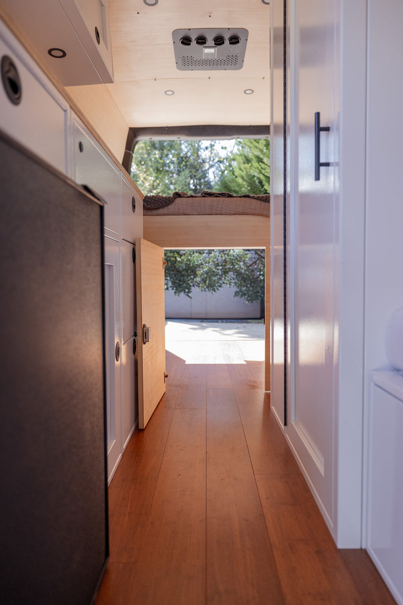 Our build is more than just beautiful—it's breathable. Every detail is carefully considered. From sound dampening the floor with cork and fabricating from Baltic birch and Bamboo each layer of the build structure, to the sealed powder coated aluminum cabinetry, we prioritized sustainably sourced and natural materials throughout the van.