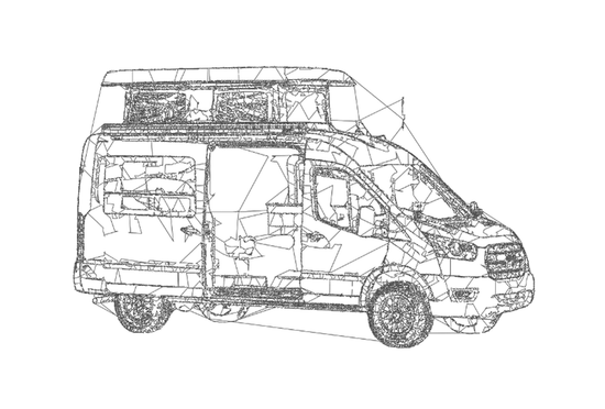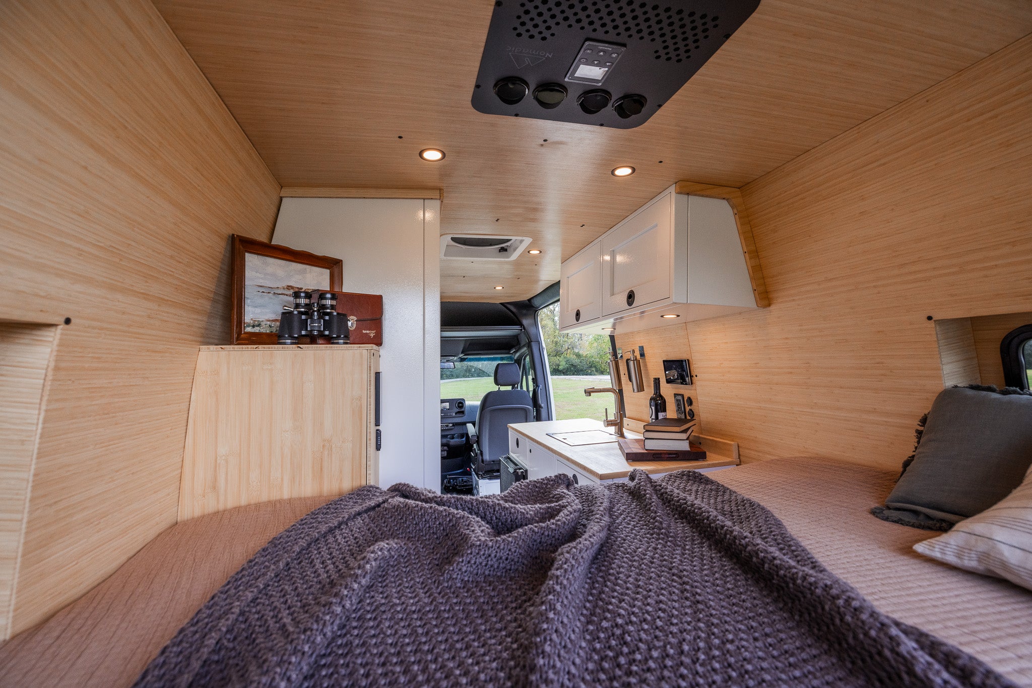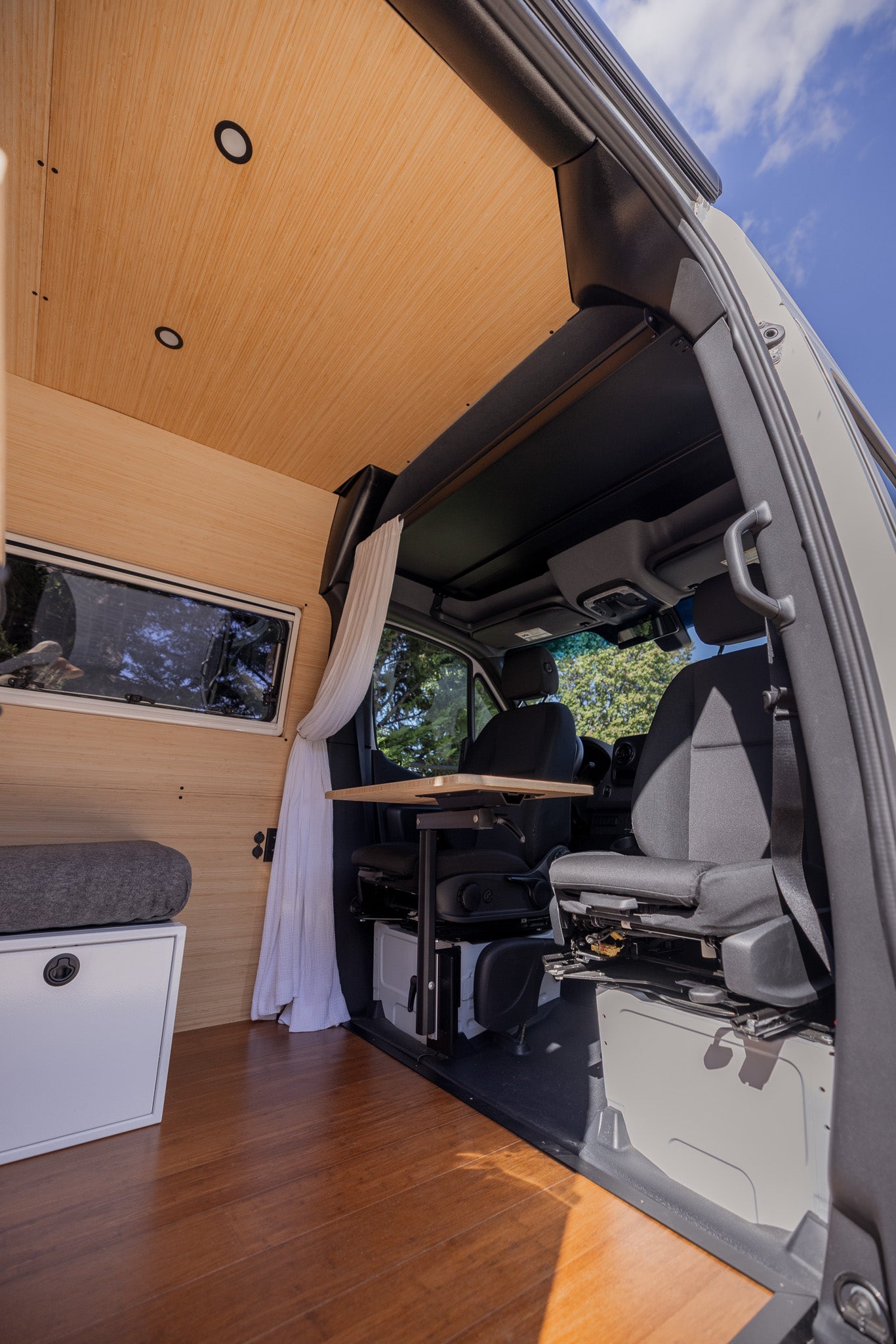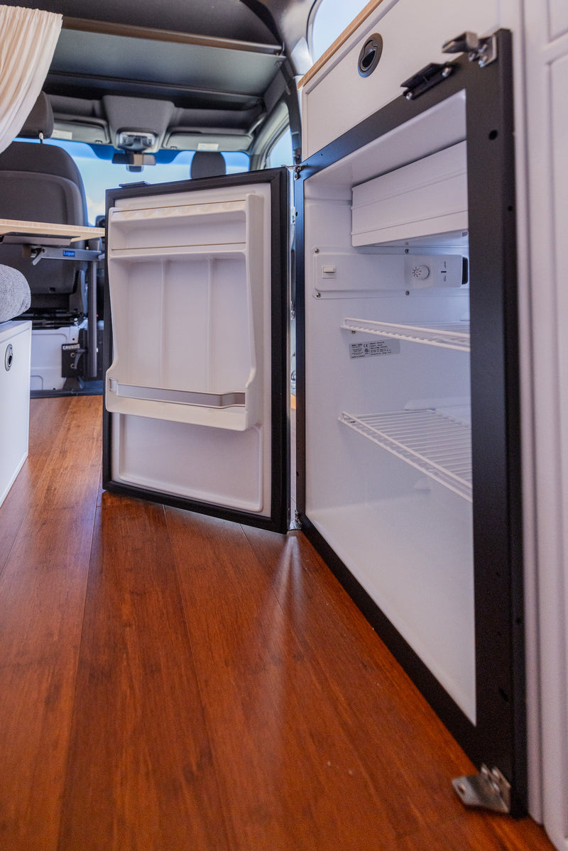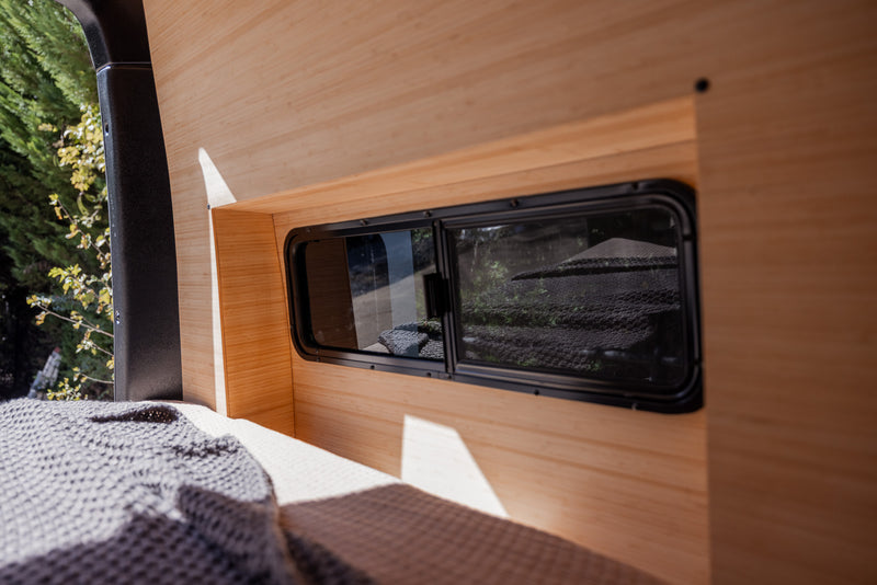 Our build is more than just beautiful—it's breathable. Every detail is carefully considered. From sound dampening the floor with cork and fabricating from Baltic birch and Bamboo each layer of the build structure, to the sealed powder coated aluminum cabinetry, we prioritized sustainably sourced and natural materials throughout the van.