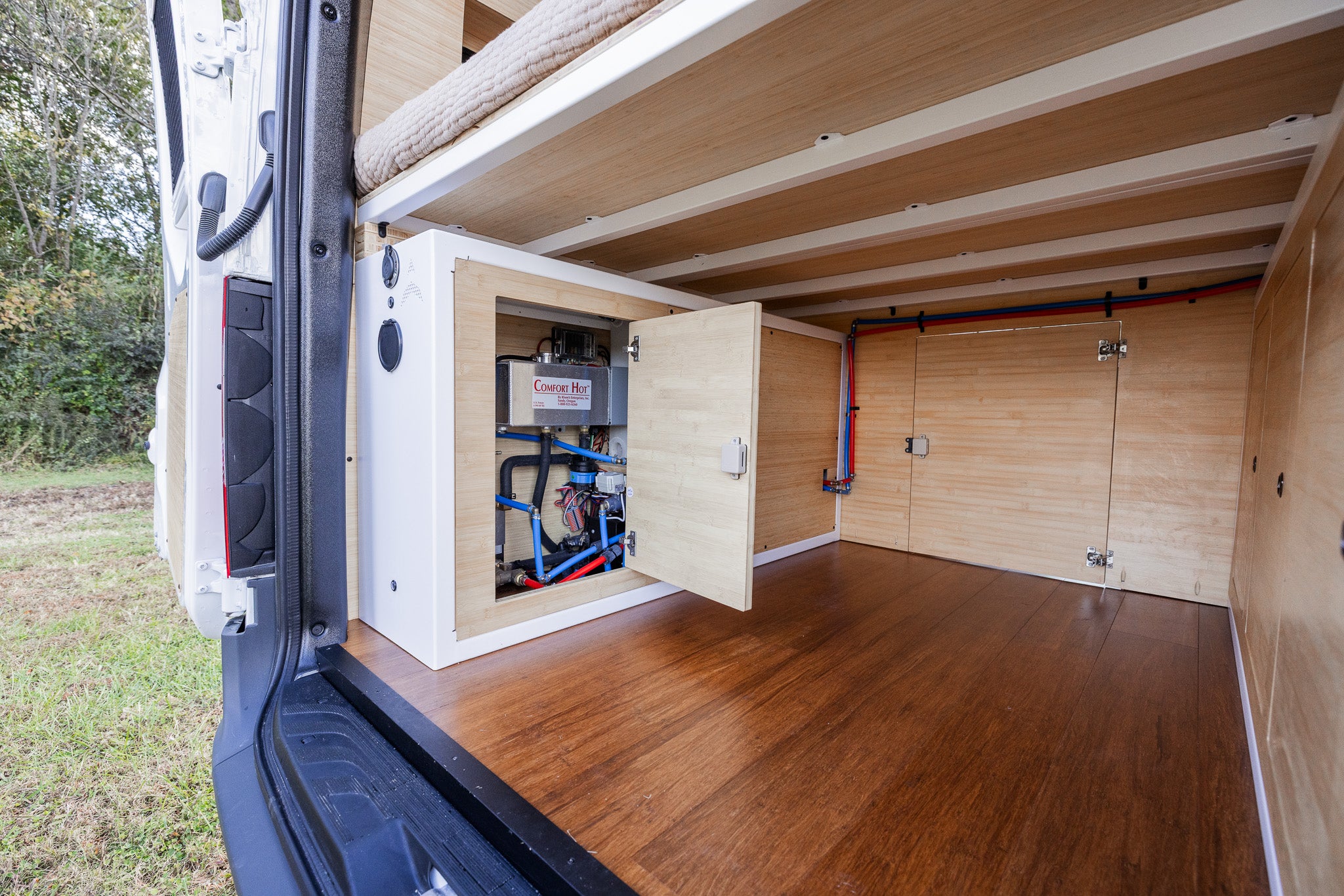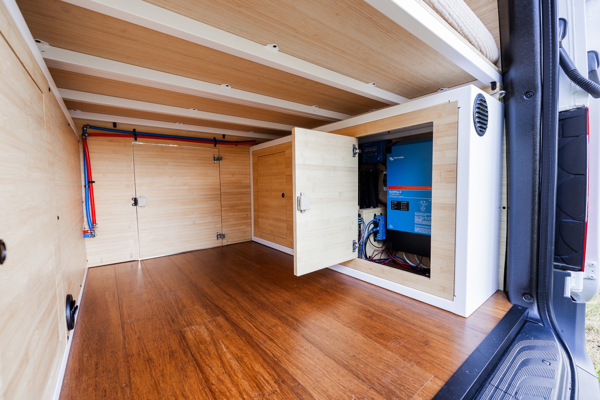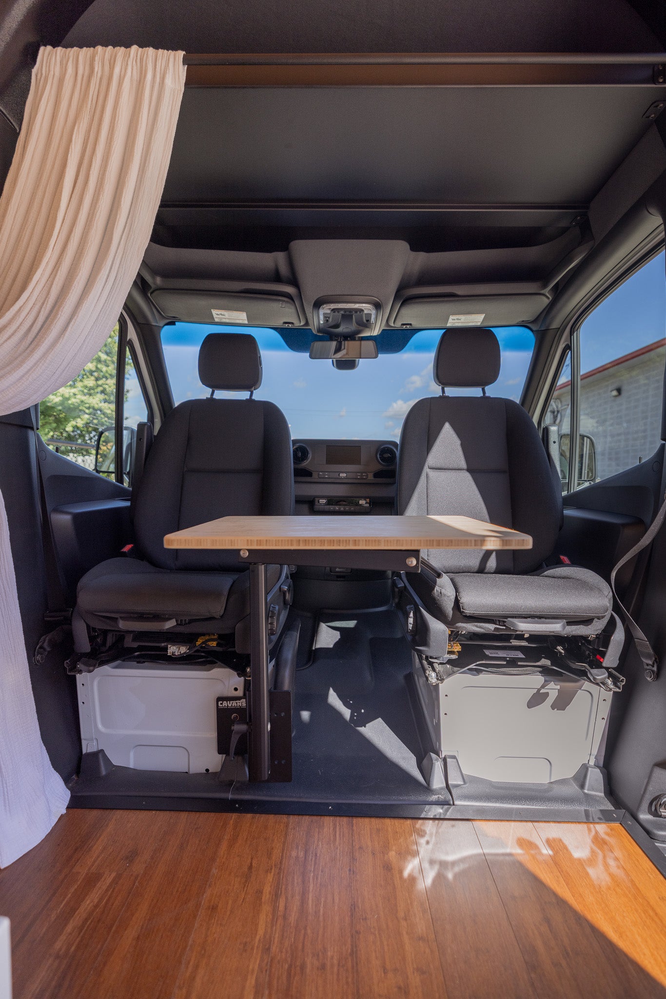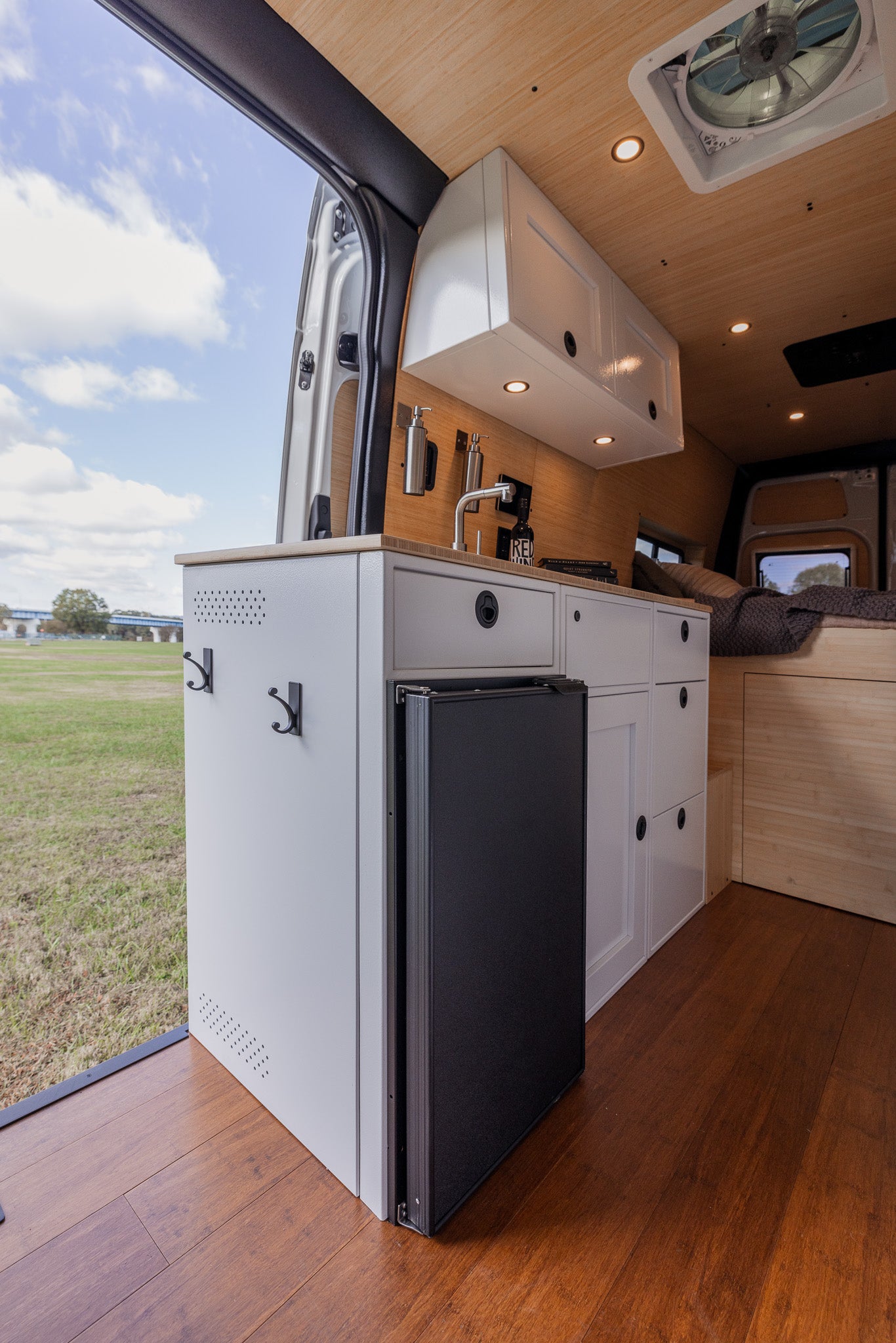 Our build is more than just beautiful—it's breathable. Every detail is carefully considered. From sound dampening the floor with cork and fabricating from Baltic birch and Bamboo each layer of the build structure, to the sealed powder coated aluminum cabinetry, we prioritized sustainably sourced and natural materials throughout the van.