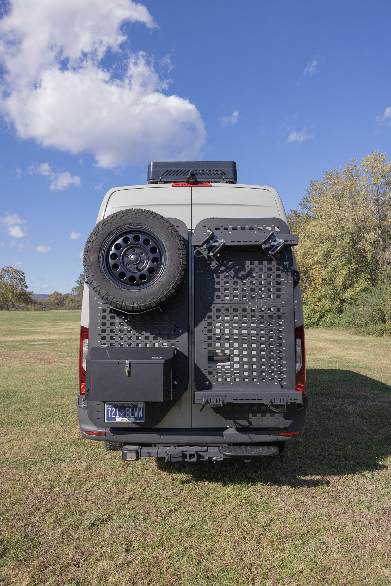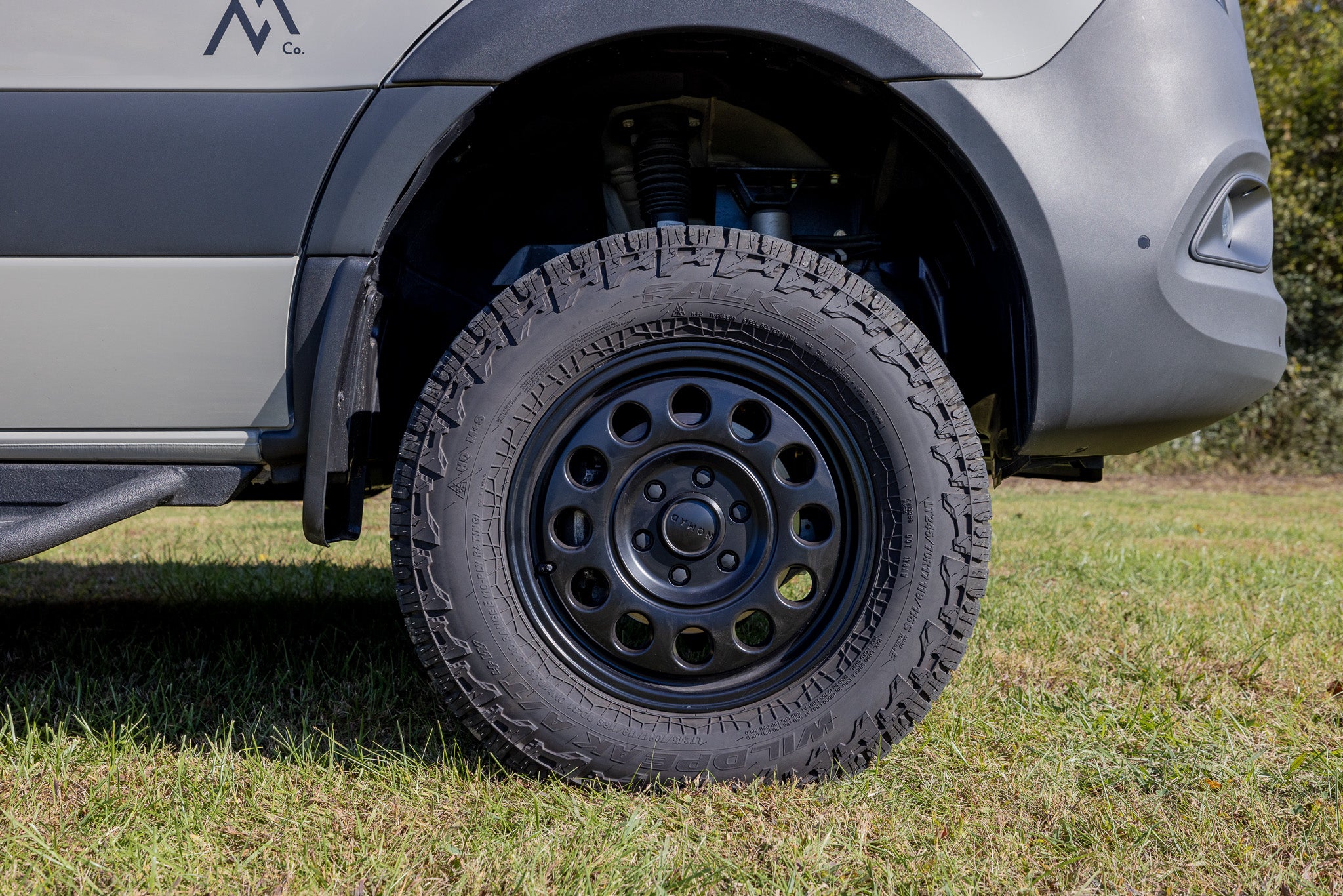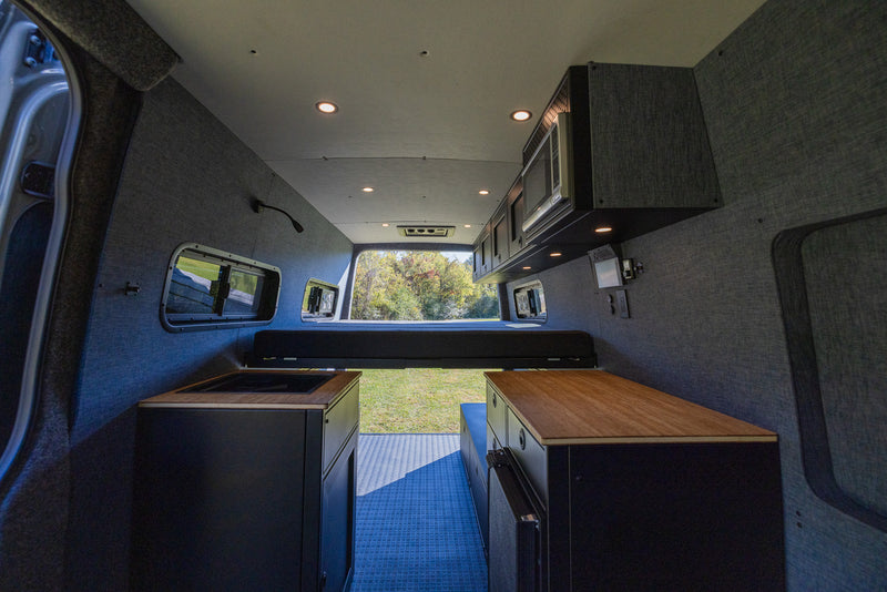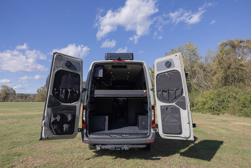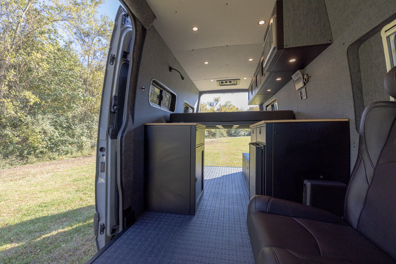 Exterior highlights include: an SCA Poptop roof for extra space and views, a VanCompass Suspension upgrade for superior handling, and rugged 17” Nomad Wheels paired with Falken WildPeak AT4w Tires. Practical additions like the Backland Rear Door System with spare tire and bike carriers, a Flatline Wet/Dry Adventure Box, and Backland Apex Slider Steps ensure you're equipped for anything.