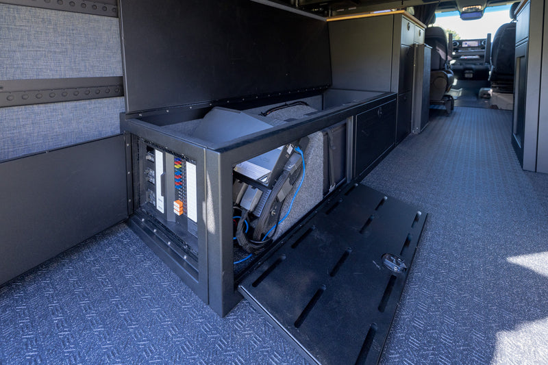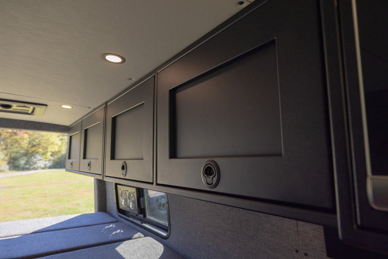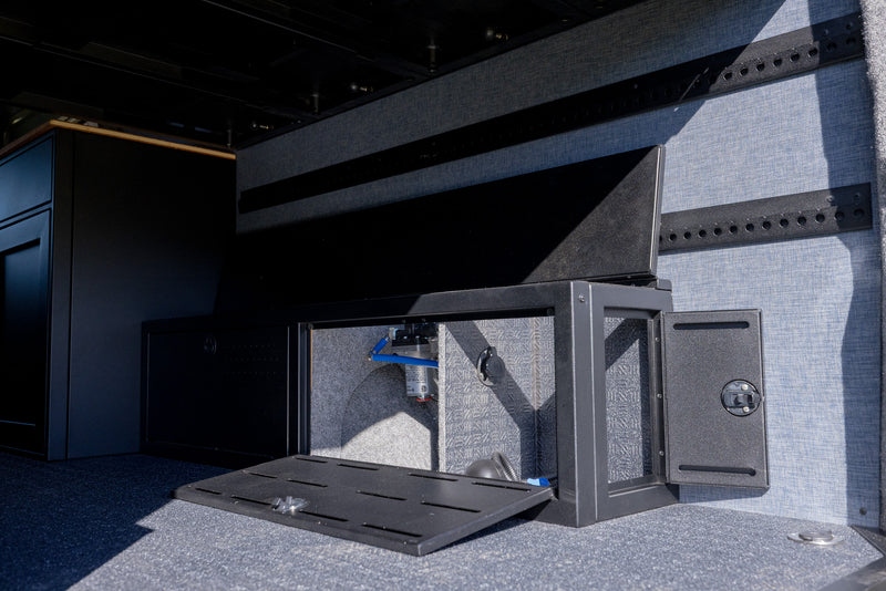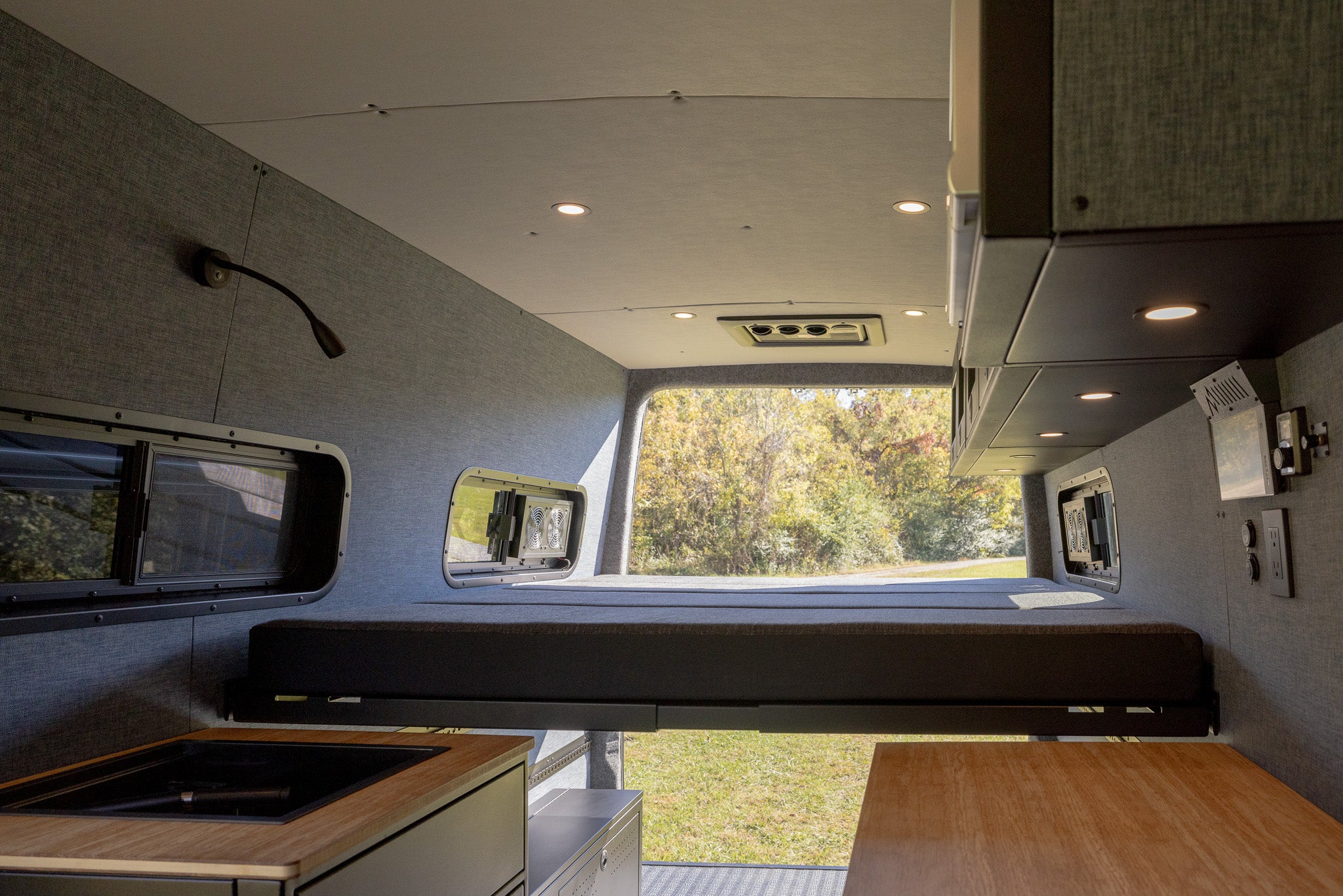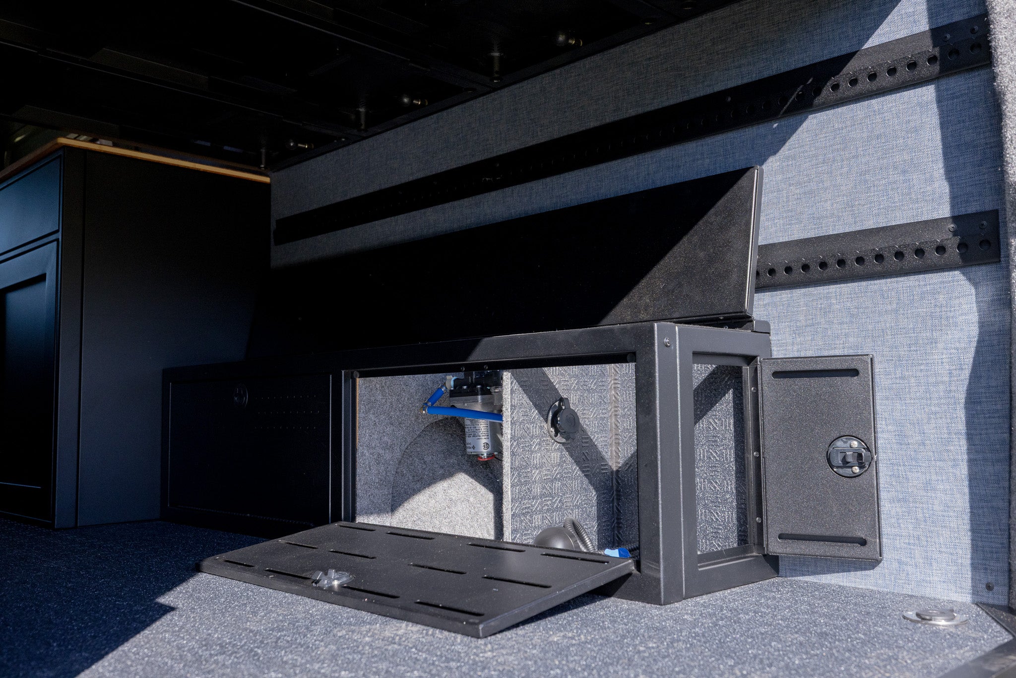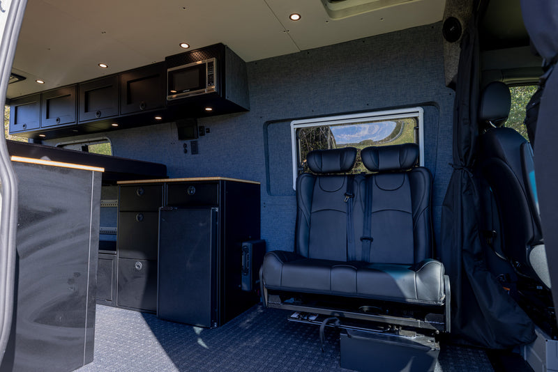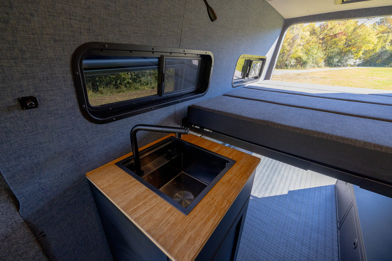 Experience true comfort and convenience with: premium fabric walls, vinyl ceilings, durable Lonseal Lonridge coin flooring, LED ceiling puck lights with dimmers, and a GoCode Trim kit with Memphis Bluetooth Audio and Sub/Amp. Swivel driver and passenger seats, a Broad Arrow 860 bifold bench seat, and Broad Arrow windows with built-in screens and blinds enhance the living space. Practical features like Van Windows Direct bunk windows (two with dual exhaust fans), a VanWife Components Bed/Bench transformation, a VanWife headliner shelf, and a Laveo Dry Flush toilet in a custom box complete the package. The entire van is fully sound deadened with Kilmat and insulated with Thinsulate for a quiet and comfortable ride. A rear water system with a 28-gallon undermount tank and electric pump, plus a rear shower sprayer, adds to the self-sufficiency.